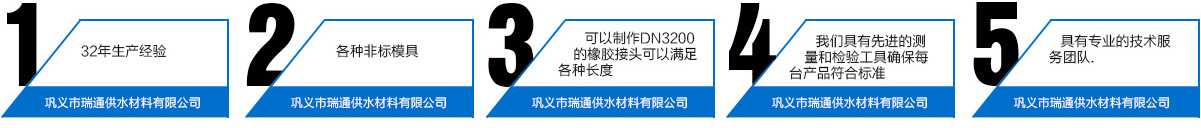 鞏義市瑞通供水材料有限公司是集科技研制、生產制造,市場開發,商貿洽談、從事貨物和技術進出口業務于一體的專業性實體生產企業。我公司主要產品已形成單球可曲撓橡膠接頭、可曲撓合成單球橡膠接頭、雙球橡膠接頭、加固型翻邊橡膠接頭、異徑橡膠接頭(大小頭)。